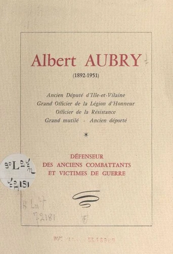 Ancien député d'Ille-et-Vilaine, grand officier de la Légion d'honneur, officier de la Résistance, grand mutilé, ancien déporté, défenseur des anciens combattants et victimes de guerre : telle fut la vie d'Albert Aubry, ici retracée par son ami G. Leguen et G. Piédérière, et précédée de son éloge funèbre par le Président de l'Assemblée Nationale Édouard Herriot.