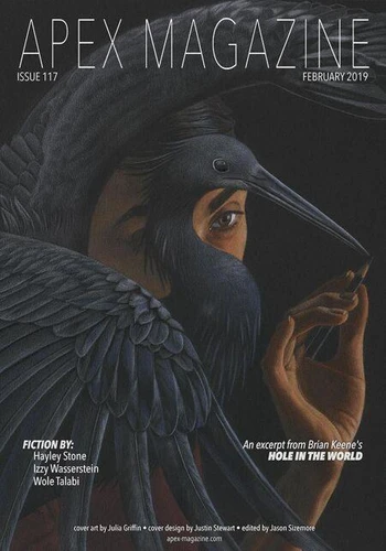 Apex Magazine is a science fiction, fantasy, and horror magazine featuring original, mind-bending short fiction. EDITORIALWords from the Editor-in-Chief - Jason SizemoreFICTIONThe Crafter at the Web's Heart - Izzy WassersteinCold Iron Comfort - Hayley StoneNecessary and Sufficient Conditions - Wole TalabiHole in the World (Novel Excerpt) - Brian KeeneNONFICTIONInterview with Author Izzy Wasserstein - Andrea JohnsonInterview with Cover Artist Julia Griffin - Russell DickersonThe Anatomy of a Transfacial Child - Woody Dismukes