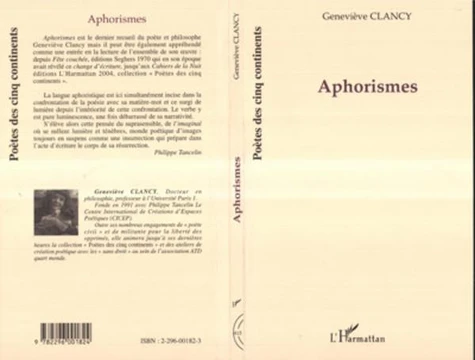 Aphorismes est le dernier recueil du poète et philosophe Geneviève Clancy mais il peut être également appréhendé comme une entrée en la lecture de l'ensemble de son oeuvre: depuis Fête couchée (Seghers, 1970) jusqu'aux Cahiers de la nuit (l'Harmattan, 2004).