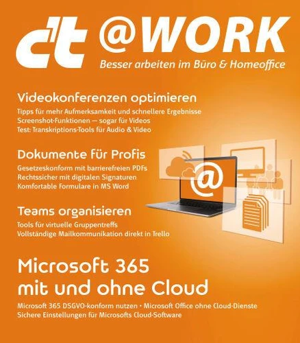Mit dem neuen Sonderheft c't @work zeigen wir Ihnen, wie Sie besser im Büro und im Homeoffice arbeiten. Sie erfahren, wie Sie Ihre Videokonferenzen nicht nur lebendiger, sondern auch effizienter gestalten. Auch der ungezwungene Small Talk mit Kollegen im Homeoffice lässt sich digital mit Tools ermöglichen. Außerdem erfahren Sie, wie Sie Microsoft 365 DSGVO-konform nutzen und was Sie bei Microsoft-Cloud beachten sollten.