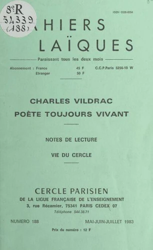 Charles Vildrac, poète toujours vivant. Notes de lecture. Vie du Cercle