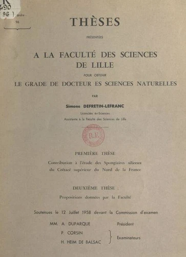 Contribution à l'étude des spongiaires siliceux du crétacé supérieur du Nord de la France. Thèse présentée à la Faculté des sciences de Lille pour obtenir le grade de Docteur ès sciences naturelles. Suivi de Propositions données par la Faculté