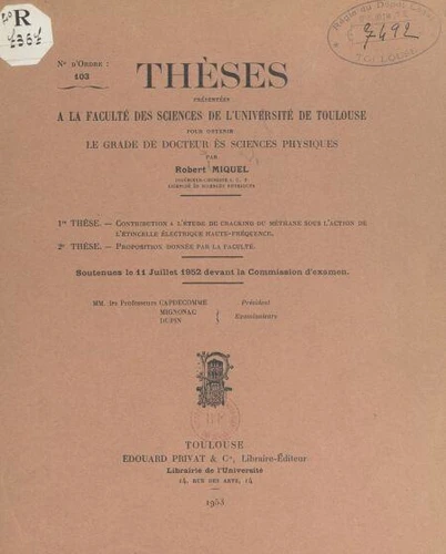 Contribution à l'étude du cracking du méthane sous l'action de l'étincelle électrique haute - fréquence. Suivi de Proposition donnée par la Faculté : structure du verre