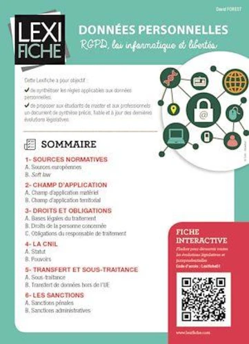 Cette Lexifiche a pour objectif : de synthétiser les règles applicables aux données personnelles, de proposer aux étudiants de master et aux professionnels un document de synthèse précis, fiable et à jour des dernières évolutions législatives