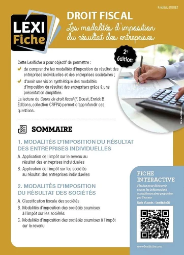 Bien que la législation et la pratique fiscales soient en perpétuelle évolution, comprendre la fiscalité des entreprises impose la maîtrise des principes qui la régissent. Cette fiche synthétique vous permettra d'avoir une vue d'ensemble des principales règles, et de leurs implications grâce à des explications succinctes et des tableaux récapitulatifs. Essentiellement destinée aux étudiants en droit fiscal pour la préparation des examens ou concours, cette fiche permettra également aux entrepreneurs de mieux cerner les incidences des choix et options qu'ils prendront, lors de la création de leur entreprise et tout au long de son exploitation.