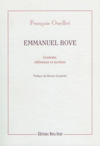 En 2002, les Éditions Nota bene publiaient le roman Mes amis d'Emmanuel Bove. François Ouellet en faisait la présentation. Deux réimpressions plus tard, le préfacier se mue en essayste et propose un superbe texte sur l'un des écrivains français méconnus à son époque qui suscite, soixante ans plus tard, le plus d'intérêt auprès des lecteurs d'aujourd'hui