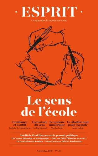 Le dossier, coordonné par Anne-Lorraine Bujon et Isabelle de Mecquenem, remet le sens de l'école sur le métier. Il souligne les limites de l'école de la confiance, rappelle l'universalité de l'aventure du sens, insiste sur la mutation numérique, les images et les génocides comme nouveaux objets d'apprentissage, et donne la parole aux enseignants. À lire aussi dans ce numéro : un inédit de Paul Ricour sur la fin du théologico-politique, un article sur les restes humains en archéologie et un plaidoyer pour une histoire universaliste.