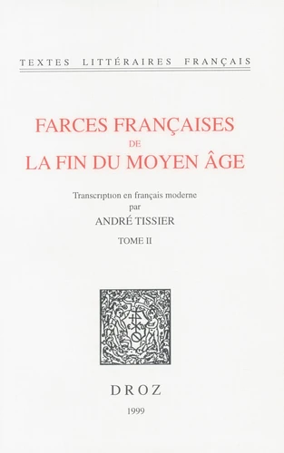 Ce deuxième tome de la transcription en français modernes des Farces du Moyen-Age, correspond aux éditions critiques des tomes IV, V et VI du Recueil des Farces parus dans les "Textes Littéraires Français", no 367 (1989), no 374 (1989) et no 391 (1990) : farces XIX à XXXVII, du Badin qui se loue à La Confession de Margot, en passant par Mimin le Goutteux, Le pont aux ness et Les Femmes qui font refondre leurs maris.