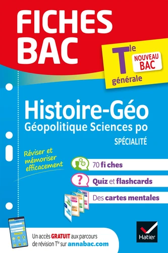 Des fiches de révision conformes au nouveau programme d'HGGSP (Histoire-géographie, Géopolitique, Science politique) Tle générale : un outil 100 % efficace pour réussir le contrôle continu et l'épreuve de spécialité. L'essentiel du programme d'HGGSP Tle en fiches détachablesSur chaque thème du programme :. des fiches de cours, claires et visuelles. des quiz pour s'évaluer. des flashcards pour réactiver ses connaissances Dans le dépliant De grandes cartes mentales pour mieux mémoriser. Avec le livre, un accès gratuit aux ressources du site www.annabac.com - vidéos, fiches, quiz exercices et sujets corrigés.
