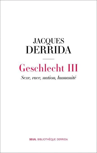 Ce volume III prend désormais place dans la série des Geschlecht : I. Différence sexuelle, différence ontologique (in Psyché, Inventions de l'autre, Galilée, 1987) ; II. La Main de Heidegger (ibid.) ; IV. L'Oreille de Heidegger : philopolémologie (in Politiques de l'amitié, Galilée, 1994). Édition établie par Geoffrey Bennington, Katie Chenoweth et Rodrigo Therezo. Préface par Rodrigo Therezo.