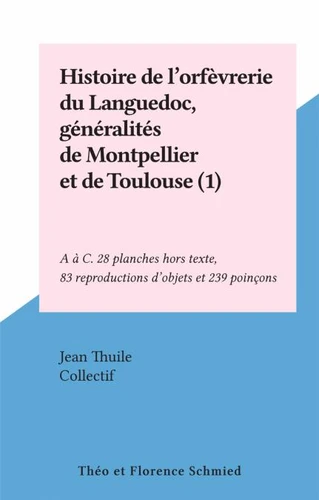 Histoire de l'orfèvrerie du Languedoc, généralités de Montpellier et de Toulouse : répertoire des orfèvres depuis le Moyen Âge jusqu'au début du XIXe siècle (1). A à C. 28 planches hors texte, 83 reproductions d'objets et 239 poinçons