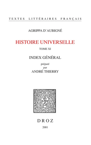 Le lecteur trouvera ici la totalité des patronymes, français et étrangers, cités par l'historien. Ils sont particulièrement nombreux : les membres de l'aristocratie royale et guerrière naturellement, persuadés d'être les moteurs de l'Histoire, les puissances spirituelles ennemies des Réformateurs, papes, jésuites, mais aussi, et c'est un des intérêts majeurs de l'ouvrage, des noms de roturiers ou de bourgeois qui ne figurent nulle part ailleurs, huguenots ou catholiques : Aubigné ne s'intéresse pas qu'à son camp., Cet index comporte aussi, en italique, un certain nombre de thèmes qu'Agrippa d'Aubigné n'a pas traités pour eux-mêmes, mais qu'il aborde dans son récit et qui reviennent assez souvent pour qu'on puisse dire qu'il leur accorderait beaucoup d'intérêt.