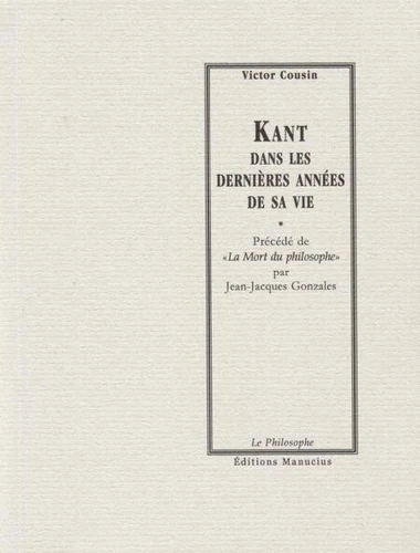Et pour plus de clarté - ou de confusion -, les éditions Manucius ont décidé de rééditer le manuscrit manquant depuis plus d'un siècle et demi, le Kant dans les dernières années de sa vie de Victor Cousin (1830), et qui se révèle, lui aussi, possédé par le vertige infini de la réécriture du Même, prisonnier de cette fascination noire et grinçante pour les derniers jours du philosophe qui irradie l'ensemble de la littérature funéraire kantienne, archives toutes borgésiennes en lesquelles se côtoient Pierre Ménard, Ireneo Funes, et le Gardien aveugle de la Bibliothèque de Babel.
