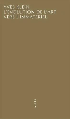 Le 3 juin 1959, Yves Klein donne une conférence à la Sorbonne : "L'évolution de l'art vers l'immatériel". Porte d'entrée idéale vers son ouvre et sa biographie, ce texte révèle les motifs constitutifs de son ouvre: le rituel, la couleur, le vide, le judo, le ciel et le feu. Au-delà de la provocation et la performance, il élabore une théorie autant poétique que spirituelle d'un art sans limites, à l'instar du travail d'un John Cage sur le silence.