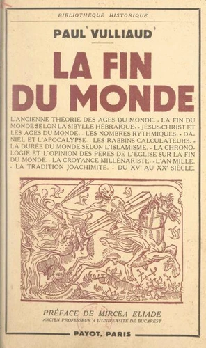L'ancienne théorie des âges du monde ; la fin du monde selon la Sybille hébraïque ; Jésus-Christ et les âges du monde ; les nombres rythmiques ; Daniel et l'Apocalypse ; les rabbins calculateurs ; la durée du monde selon l'islamisme ; la chronologie et l'opinion des pères de l'Église sur la fin du monde ; la croyance millénariste ; l'an mille ; la tradition dite Joachimite ; du XVe au XXe siècle
