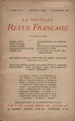 La Nouvelle Revue Française (1908 - 1943) N° 86 novembre 1920