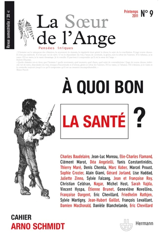 Ouverture Spéciale dédicace à Kostas Axelos Image de la pensée Charles Baudelaire, « La poésie n'a pas d'autre but qu'elle-même ». Editorial Jean-Luc Moreau, « Trop ordinaire bonne santé ? » ; Elie-Charles Flamand, « La progression a pris des risques et autres poèmes ». Dossier : À QUOI BON LA SANTÉ ? Clément Marot, « Epître au roy par Marot étant malade » ; Déa Angelelli, « La conception de la santé dans la médecine traditionnelle chinoise » ; Yannis Constantinidès, « La crise salutaire dans la médecine hippocratique » ; Thierry Maré, « Lettre édifiante & curieuse du Japon à La Soeur de l'ange » ; Denis Chemla, « Les querelles médicales à travers les âges » ; Marc Kober, « Des avantages du repos forcé » ; Marcel Proust, « La maladie de ma grand-mère » ; Sophie Crozier, « La décision médicale en situation d'incertitude » ; Alain Giami, « La santé sexuelle » ; Gérard Jorland, « Le souci de soi » ; Lise Haddad, « Permanence et transformation du soi dans la maladie » ; Juliette Zinno, « De l'autisme à la mélancolie » ; Yannis Constantinidès, « Une éthique sans moraline (la philosophie iconoclaste de Dr House) » ; Sylvie Faizang, « L'automédication, choix thérapeutique ou acte politique » ; Jean et François Rey, « ''Diet for life'' ou liberté conditionnelle » ; Christian Celdran, « Santé / Schibboleth » ; Nagar, « Croisière à bord du Pompidolium » ; Michel Host, « Avis d'un agonisant sur la médecine et ses médecins » ; Sarah Vajda, « Une vieille grippe ou du bon usage de la maladie selon Péguy » ; Vincent Hyspa, « Chez le docteur ».