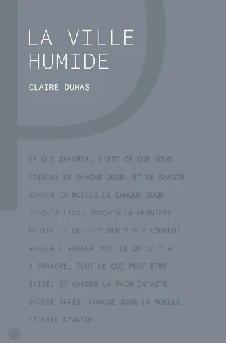 » Attendre l'arrivée d'un jour neuf... Il ne reste rien d'autre à cette jeune femme "emmurée", incapable d'emprunter la moindre rue qui lui permettrait de fuir les odeurs de vin d'un père alcoolique ainsi que son impuissance face à sa mère rongée par la maladie. Avec texte fulgurant et poétique, Claire Dumas nous invite à entrer dans le brouillard de La Ville Humide.