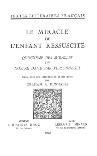 Le Miracle de l'Enfant ressuscité. Quinzième des Miracles de Nostre Dame par personnages