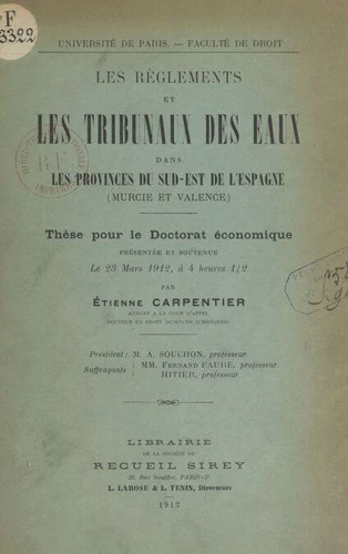 Les règlements et les Tribunaux des eaux dans les provinces du sud - est de l'Espagne (Murcie et Valence). Thèse pour le Doctorat économique présentée et soutenue le 23 mars 1912, à 4 heures 30