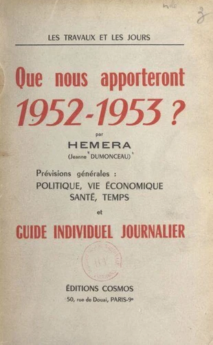 Les travaux et les jours. Que nous apporteront 1952 - 1953 ?. Prévisions générales : politique, vie économique, santé, temps et guide individuel journalier