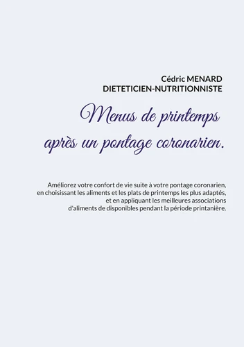 L'auteur vous propose trois mois de menus spécifiquement adaptés à votre chirurgie cardiaque, tous très simples à mettre en pratique grâce à des plats, des légumes et des fruits de printemps vous étant proposés, vous permettant ainsi de mieux adapter votre alimentation à votre cardiopathie.