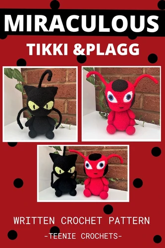 Here you have the written crochet pattern for Tikki and Plagg from Miraculous. To Make These you will need:3.5mm and 3mm Crochet HooksDK yarn in red, black, white, blue and greenToy stuffingDarning needle and scissorsThe completed dolls measures 9" tall. Pattern Tested. Pattern written using US terminology. Skill Level: Easy.
