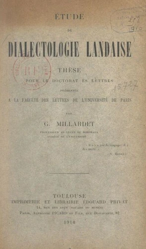 Petit atlas linguistique d'une région des Landes. Contribution à la dialectologie Gasconne. Thèse pour le Doctorat ès lettres présentée à la Faculté des lettres de l'Université de Paris