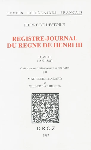 Troisième tome du journal de Pierre de L'Estoile, qui constitue, de l'avis général, le document le plus important et le plus curieux pour la connaissance historique et littéraire de la fin du XVIè siècle français. Pour la première fois, ce texte est édité d'après le manuscrit original 6678 et les variantes du manuscrit 6888 de la Bibliothèque Nationale. Il reproduit pour les années 1579 à 1581 des passages (en prose et en vers) entièrement inédits.