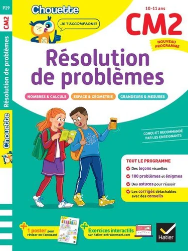 Ce cahier conçu et recommandé par des enseignants permettra à votre enfant de s'entrainer, de consolider ses acquis et de s'exercer sur des problèmes de Mathématiques durant toute son année de CM2. Pour chaque domaine d'apprentissage (Nombres et Calculs, Espace et Géométrie, Grandeurs et Mesures), retrouvez : Un test de maths pour évaluer le niveau de l'enfant et repérer les notions à réviser en priorité Des problèmes avec trois niveaux de difficulté ciblant les notions clés du programme de CM2, et des astuces parents pour donner un coup de pouce à votre enfant Des conseils de la Chouette pour aider votre enfant à résoudre les exercices Des corrigés détachables pour vérifier les acquis et évaluer les résultats de l'enfant Un tableau de bord pour reporter les résultats En cadeau, un grand poster à colorier !.
