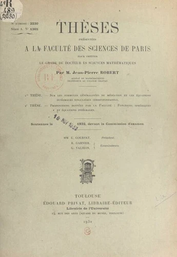 Sur les formules généralisées de médiation et les équations intégrales singulières correspondantes. Suivi de Propositions données par la Faculté : fonctions sphériques et équations intégrales