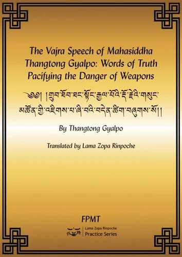 Words of Truth Pacifying the Danger of Weapons is a prayer of the Great Tantric Yogi Thangtong Gyalpo. Mahasiddha Thangtong Gyalpo was a great yogi of fifteenth-century Tibet. In addition, he was a skilled engineer and artist, famous for helping the people of Tibet in very practical ways. He is said to have built fifty-eight iron bridges, sixty wooden bridges, 118 ferry crossings, 120 assembly halls and temples, 111 stupas, and many hundreds of large and small statues, and created innumerable paintings.