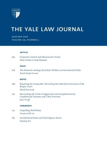 This issue of the Yale Law Journal (the third issue of academic year 2015-2016) features articles and essays by notable scholars. Contents include:Article, "Corporate Control and Idiosyncratic Vision, " by Zohar Goshen & Assaf HamdaniEssay, "The Domestic Analogy Revisited: Hobbes on International Order, " by David Singh GrewalNote, "Repairing the Irreparable: Revisiting the Federalism Decisions of the Burger Court, " by David Scott LoukNote, "Reconciling the Crime of Aggression and Complementarity: Unaddressed Tensions and a Way Forward, " by Julie VeroffComment, "Unpacking Wolf Packs, " by Carmen X.