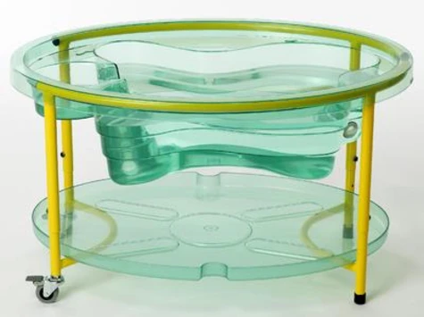 Un petit bac à eau et à sable transparent pour faciliter les expériences et les observations. Un petit bac à eau et à sable transparent constitué d'un bac en plastique résistant avec rebords et muni : d'un robinet de vidange, d'un couvercle qui peut se placer sous le bac pour y déposer les accessoires de pieds tubulaires réglables en hauteur (de 44 à 58 cm) équipés de roulettes avec frein.