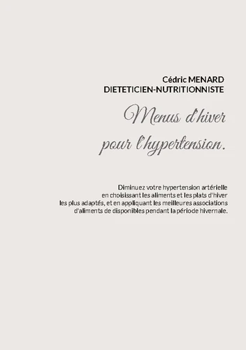 Cet ouvrage est dédié à toutes les personnes souffrant d'hypertension et il offre aux détenteurs des ouvrages du même auteur : "Quelle alimentation pour l'hypertension ? " et "Recettes et menus pour l'hypertension" un ouvrage parfaitement complémentaire. L'auteur vous propose trois mois de menus spécifiquement adaptés à votre hypertension, tous très simples à mettre en pratique grâce à des plats, des légumes et des fruits d'hiver vous étant proposés, vous permettant ainsi de mieux adapter votre alimentation à votre pathologie.