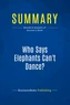 The must-read summary of Louis Gerstner's book : "Who Says Elephants Can't Dance ? : Inside IBM's Historic Turnaround". This complete summary of the ideas from Louis Gerstner's book "Who Says Elephants Can't Dance ? " shares Gerstner's experiences in taking charge of IBM and turning the company around to regain its position as an industry leader. This book contains all of the challenges and obstacles faced by the company and how Gerstner overcame them.