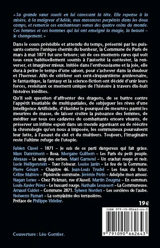 Afin de célébrer son cent-cinquantième anniversaire, le fantastique, la fantasy et la science-fiction ont décidé d'unir leurs forces, revisitant ce moment unique de l'histoire à travers dix-huit histoires inédites. Qu'il soit question d'affronter des dragons, de se battre contre l'appétit insatiable de multispatiales, de subjuguer les rêves d'une Intelligence Artificielle, d'élucider le pourquoi de meurtres parmi les meurtres de masse, de laisser croître la puissance des femmes, de méditer sur tous ces cadavres de combattants encore vivants, de préserver un infime espoir dans un monde agonisant ou de réécrire la chronologie qu'on nous a imposée, les communeux poursuivent leur lutte, à l'assaut du ciel et du multivers.