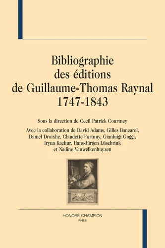 Guillaume-Thomas Raynal (1713-1796) est connu surtout comme l'auteur (en collaboration avec Diderot et d'autres écrivains) de l'Histoire philosophique des deux Indes, dont la première édition date de 1770 et qui est devenue rapidement un véritable bestseller. Raynal est également l'auteur de plusieurs autres ouvrages, les uns antérieurs à l'Histoire, les autres pendant la Révolution. La présente bibliographie, qui est le fruit de recherches effectuées dans une centaine de bibliothèques, se base sur les principes de la bibliographie matérielle classique et doit beaucoup à la perspective de l'histoire du livre.