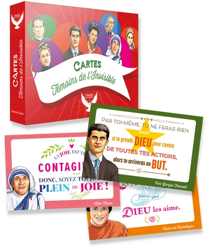 Voici un cadeau original à offrir à des adolescents, collégiens, lycéens ou jeunes étudiants ! Ils pourront décider d'utiliser les cartes comme calendrier de l'Avent, en piochant une carte pour vivre leur journée sous le regard d'un grand saint ou envoyer la carte à un ami ou un proche, pour rendre l'Avent plus spirituel. Ils pourront aussi conserver l'étui toute l'année, comme carte de correspondance ou pour décorer leur chambre, pour vivre au quotidien en Témoin de l'Invisible ! Citations de Carlo Acutis, Charles de Foucauld, Bernadette Soubirous, Pier Giorgio Frassatti, Mère Teresa, Sainte Thérèse...
