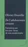 Je témoigne ici d'une expérience de psychothérapeute, adossé à la psychanalyse et à l'anthropologie, travaillant dans des espaces urbains sis aux franges des aspects plus ordinaires et davantage policés des villes modernes, que ce soit en Europe ou en Afrique de l'Ouest. Si le terme d'"errance" (errare/itinerare, l'erreur certes mais aussi l'itinéraire) atteste d'un désordre de l'orientation des corps dans les espaces publics, sa réalité actuelle nous fait rencontrer de jeunes sujets redoutant plus que tout de se trouver retenus dans une demeure.