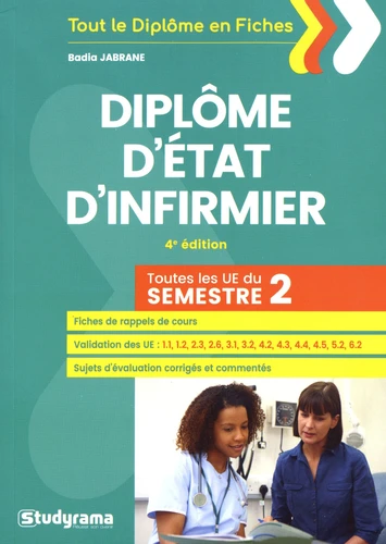 S2. Soins relationnels ; UE 4.3. S2. Soins d'urgence ; UE 4.4. S2. Thérapeutiques et contribution au diagnostic médical ; UE 4.5. S2. Soins infirmiers et gestion des risques ; UE 5.2. S2. Evaluation d'une situation clinique ; UE 6.2. Anglais. Pour chaque UE vous sont proposés : la présentation et les objectifs de l'UE ; les compétences à mobiliser et les prérequis nécessaires ; les modalités d'évaluation et les critères de validation ; des sujets d'évaluation et d'entraînement avec corrigés.