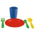20 pièces en plastique : 4 assiettes rouges, 4 gobelets bleus, 4 couteaux verts, 4 fourchettes vertes et 4 cuillères jaunes. 20 pièces en plastique : 4 assiettes rouges, 4 gobelets bleus, 4 couteaux verts, 4 fourchettes vertes, 4 cuillères jaunes.