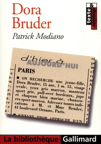 ''PARIS. On recherche une jeune fille, Dora Bruder, 15 ans, 1 m 55, visage ovale, yeux gris-marron, manteau sport gris, pull-over bordeaux, jupe et chapeau bleu marine, chaussures sport marron. Adresser toutes indications à M. et Mme Bruder, 41 boulevard Ornano, Paris.''