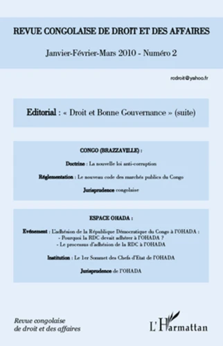 Après l'éditorial consacré au "Droit et bonne gouvernance", ce numéro aborde deux thématiques, l'une sur le Congo Brazzaville (La nouvelle loi anti-corruption, le nouveau code des marchés publics au Congo, Jurisprudence congolaise) et l'Espace OHADA (l'adhésion de la RDC à l'OHADA, le 1er sommet des Chefs d'Etat de l'OHADA, Jurisprudence de l'OHADA).