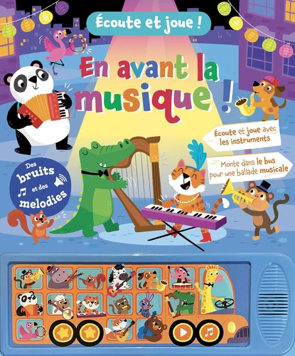 En avant la musique ! Dans ce livre sonore, les jeunes enfants vont monter dans un bus pour partir à la rencontre de joyeux groupes de musique. A chaque arrêt, de nombreuses surprises les attendent. Le module sonore (15 sons et 3 mélodies) propose un jeu très amusant : écouter le son d'un instrument et l'associer à son image. Si la réponse est bonne, un jingle retentit.