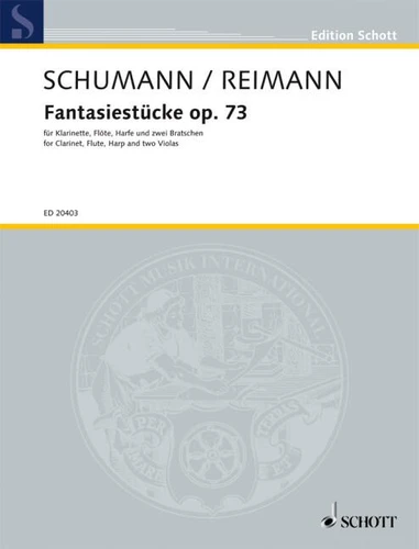 Fantasiestücke. transcrites pour clarinette, flûte, harpe et deux altos par Aribert Reimann. op. 73. clarinet in A, flute, harp and 2 violas. Partition et parties.
