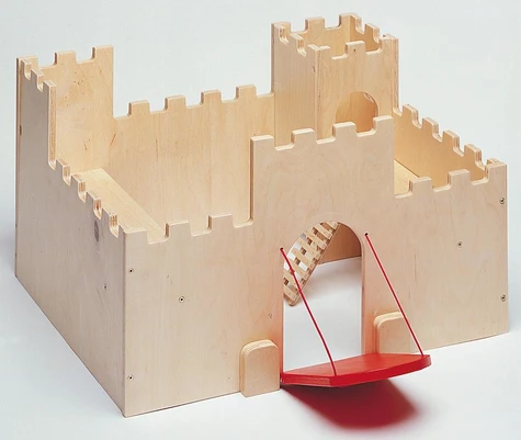 Carré et très robuste, le château fort est l'occasion d'innombrables situations de jeu pour plusieurs enfants. Ce château fort possède un pont-levis qui s'actionne avec une cordelette, sertie au bout pour empêcher son retrait. Conçu sans fond, il est posé directement sur le sol. Les créneaux sont légèrement arrondis. Accompagné d'une échelle en bois.