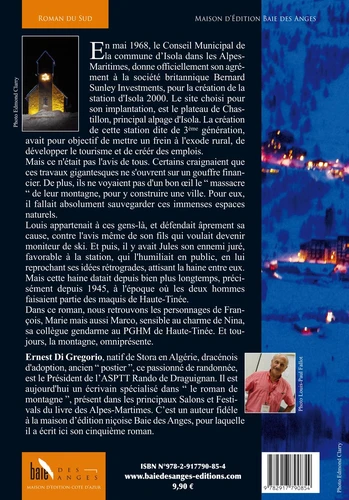 Et puis, il y avait Jules son ennemi juré, favorable à la station, qui l'humiliait en public, en lui reprochant ses idées rétrogrades, attisant la haine entre eux. Mais cette haine datait depuis bien plus longtemps, précisément depuis 1945, à l'époque où les deux hommes faisaient partie des maquis de Haute-Tinée. Dans ce roman, nous retrouvons les personnages de François, Marie mais aussi Marco, sensible au charme de Nina, sa collègue gendarme au PGHM de Haute-Tinée.