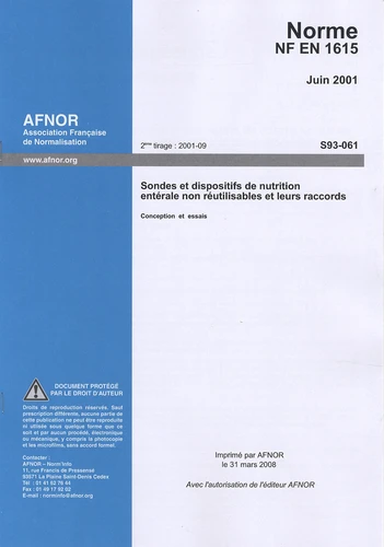 Norme NF EN 1615. Sondes et dispositifs de nutrition entérale non réutilisables et leurs raccords