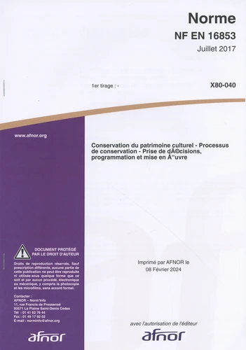 Norme NF EN 16853 Conservation du patrimoine. Processus de conservation - Prise de décisions, programmation et mise en œuvre
